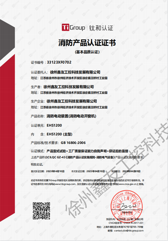 徐州鑫友工控科技發(fā)展有限公司成立于2008年,占地31600平方米,全資子公司:江蘇良紫工程科技有限公司,旗下 有“鑫友”及“MASTER.W主人窗控”兩個(gè)品牌系列,公司全面貫徹執(zhí)行IS09001:2015質(zhì)量管理體系標(biāo)準(zhǔn),產(chǎn)品順利通過歐盟CE認(rèn)證和中國(guó)***消防電子產(chǎn)品認(rèn)證,通過可燃性粉塵環(huán)境下、爆炸性環(huán)境下防爆合格產(chǎn)品檢驗(yàn)。排煙天窗整窗通過***消防產(chǎn)品質(zhì)量監(jiān)督檢驗(yàn)中心檢測(cè)。先后獲得多項(xiàng)******及榮譽(yù)證書。集研發(fā)、加工、生產(chǎn)、制造、銷售、安裝及售后于一體,是一家高起點(diǎn)、研發(fā)能力強(qiáng)的專業(yè)智能化企業(yè)。