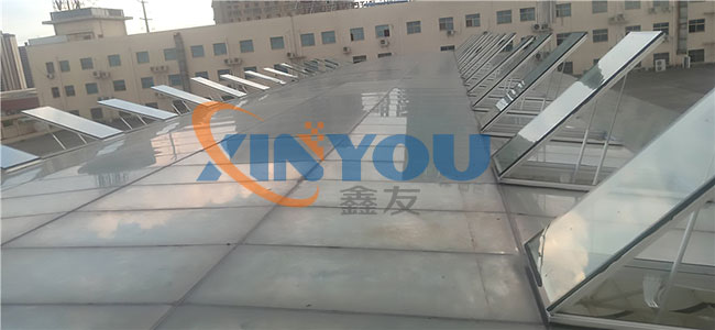 根據施工圖紙,需先將部分采光玻璃拆除,光滑的玻璃屋面給現場施工增加了難度。現場環境不允許大型作業車入場作業,鑫友售后安裝部員工硬是憑自身力氣將一塊塊玻璃拆除,更換上鑫友電動排煙窗。