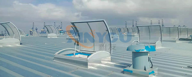圓拱形的設(shè)計,外觀美觀大氣,能更好的防水,同時有效減少風(fēng)壓阻力,天窗頂部為采光板,有效增加室內(nèi)亮度,開啟電機(jī)設(shè)計成24V電壓,可連接消防聯(lián)動控制系統(tǒng)及風(fēng)、雨、煙感應(yīng)器。***開啟角度為45°。